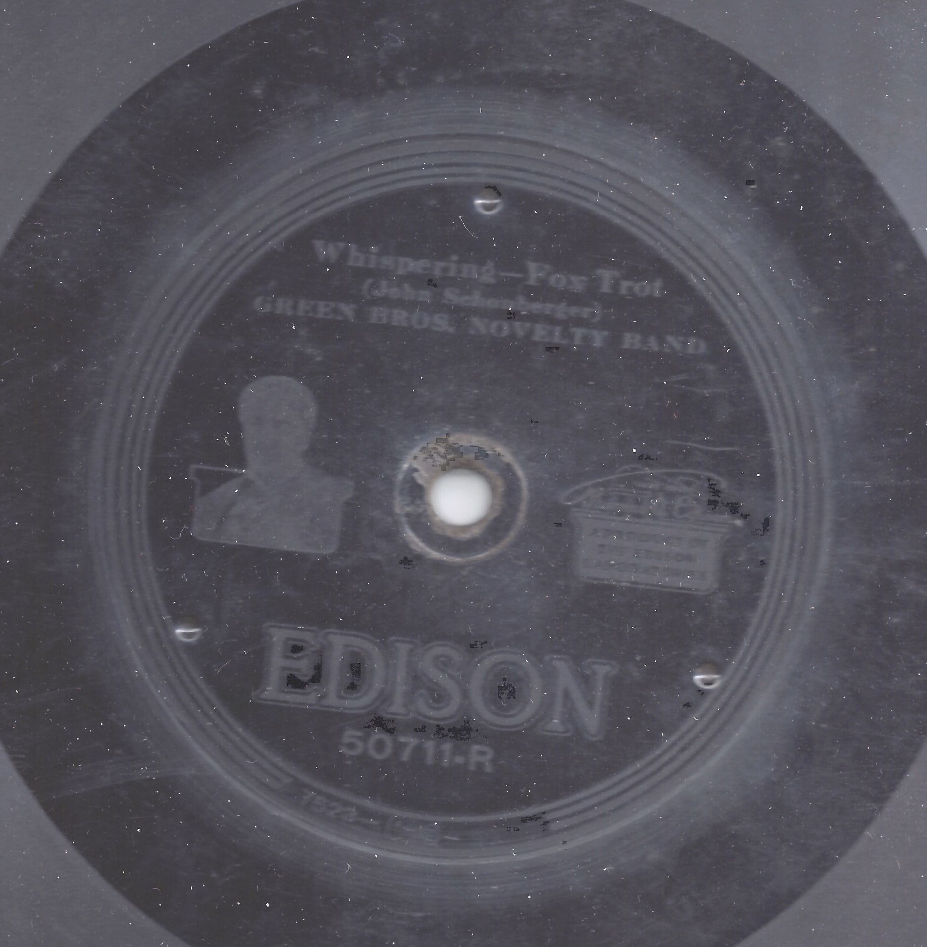 Side R: Whispering Foxtrot by Green Bros. Novelty Band Side L: Feather Your Nest Foxtrot by Lenzberg's Riverside Orchestra On Edison Diamond Disc, black label, Record number 50711. In very, very good condition with no chips or cracks. Please note: Standard domestic Shipping and Handling of $5.00 is included in the cost of this record. |