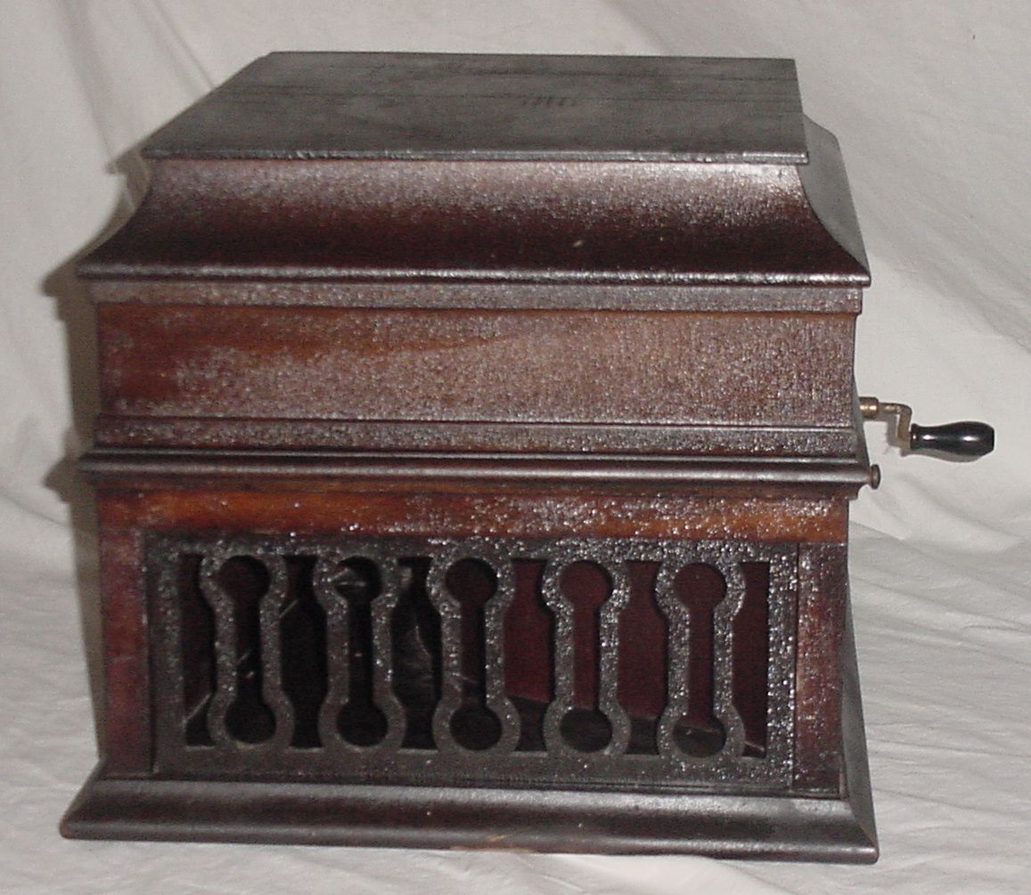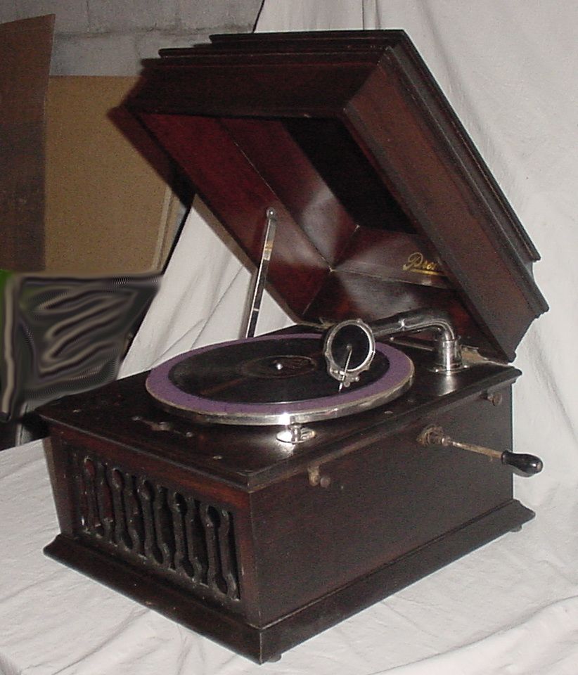 This is a Premier brand tabletop phonograph in a mahogany case. It has a rebuilt reproducer, 2 spring motor and plays well. The case is in very good condition with some varnish crazing. This is a nice machine for someone who just wants one to play their old records on. Included is a pack of Loud Tone steel needles. Shipment will be via UPS. Pickup at my home or at the Elkhorn Antique Flea Market is available. I will also visit the Union, IL Phonograph show on Saturday, June 11, 2011 and direct pickup can be arranged there as well. Shipping and handling costs of $45.00 will be refunded upon pickup if one of these locations is chosen. Click here for Elkhorn dates