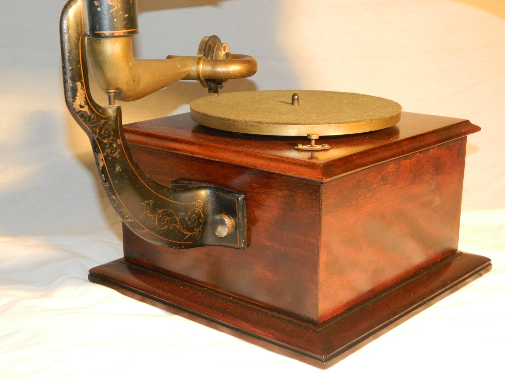 On the bottom of the case there are two (2) decal labels. One of the labels looks like a Victrola label and in the corner has Jan 1 1915. The other label has a picture of the motor which is like an early Victrola IV (4). This is all correct on this very late "O". The case looks nice but must have been refinished at some time. The reproducer has been rebuilt and sounds good. The nickel plating is a little worn in places. The back bracket has 90% of the original paint and decal. The horn is in good condition, but is the wrong color. A Victor "O" horn should be orange. This horn has been painted black with decorative decals added. Shipment will be via FedEx in two containers. The horn will be in reinforced boxing. Pickup at my home or at the Elkhorn Antique Flea Market is available. I will also visit the Union, IL Phonograph show on Saturday, June 7, 2014 and direct pickup can be arranged there as well. The $60 shipping fee will be refunded for direct pickups. Delivery within 100 miles of New Berlin, WI can be arranged for the same cost as shipping. Shipping is to a US address only. International buyers must arrange for their own shipping agent. Click here for Elkhorn dates